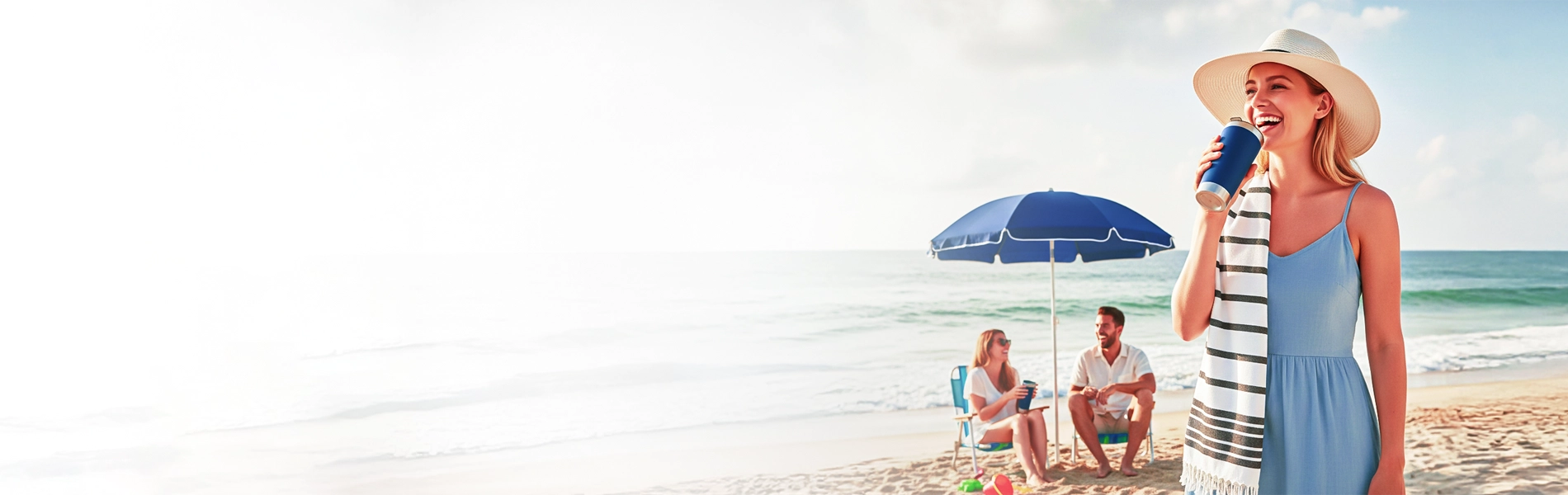 Copo térmico, guarda-sol e toalha. Um único kit para curtir o verão com mais conforto, praticidade e estilo.