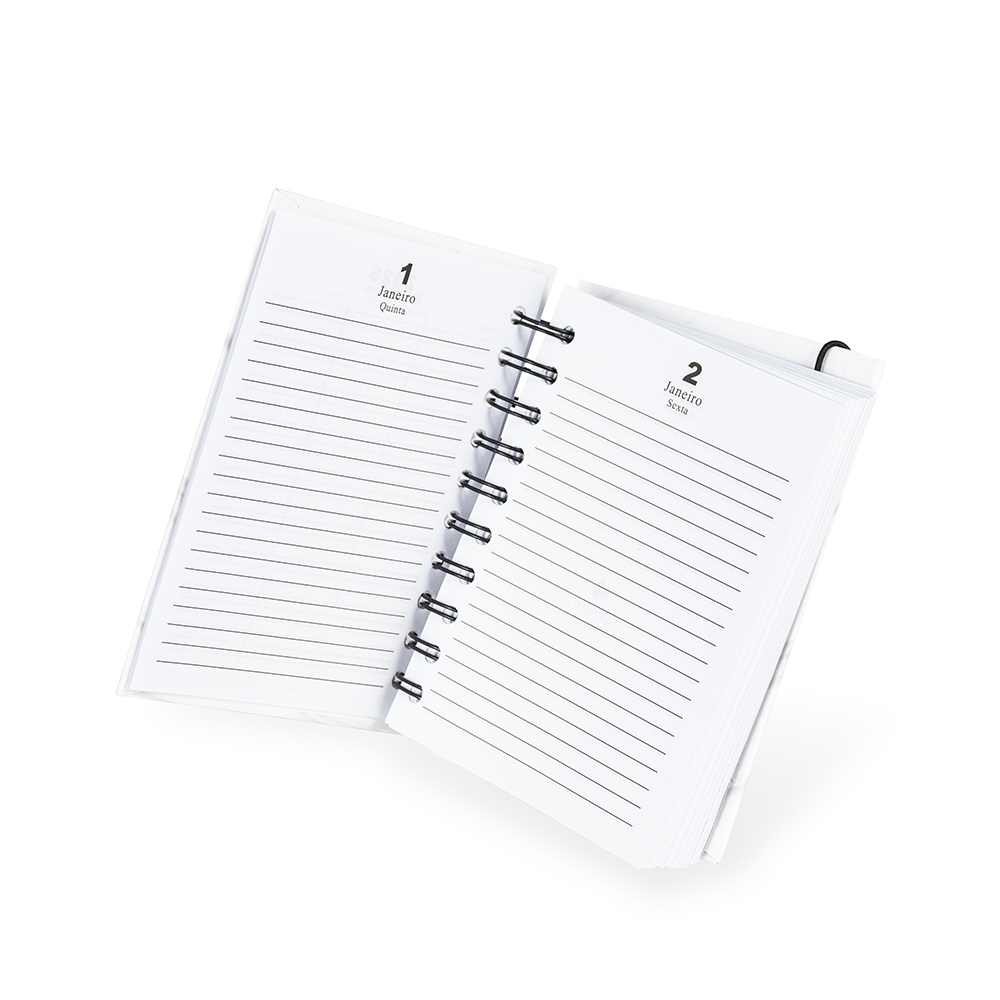 Descrição: Agenda diária 2026 com capa dura, elástico de fechamento, marca-páginas de fita de cetim e encadernação Wire-O. Conta ainda com páginas dedicadas a dados pessoais, calendários de 2026 até 2028, além de listas de metas, planejamento mensal e contatos.