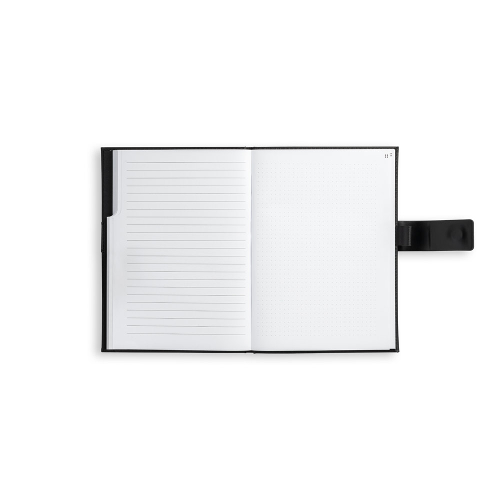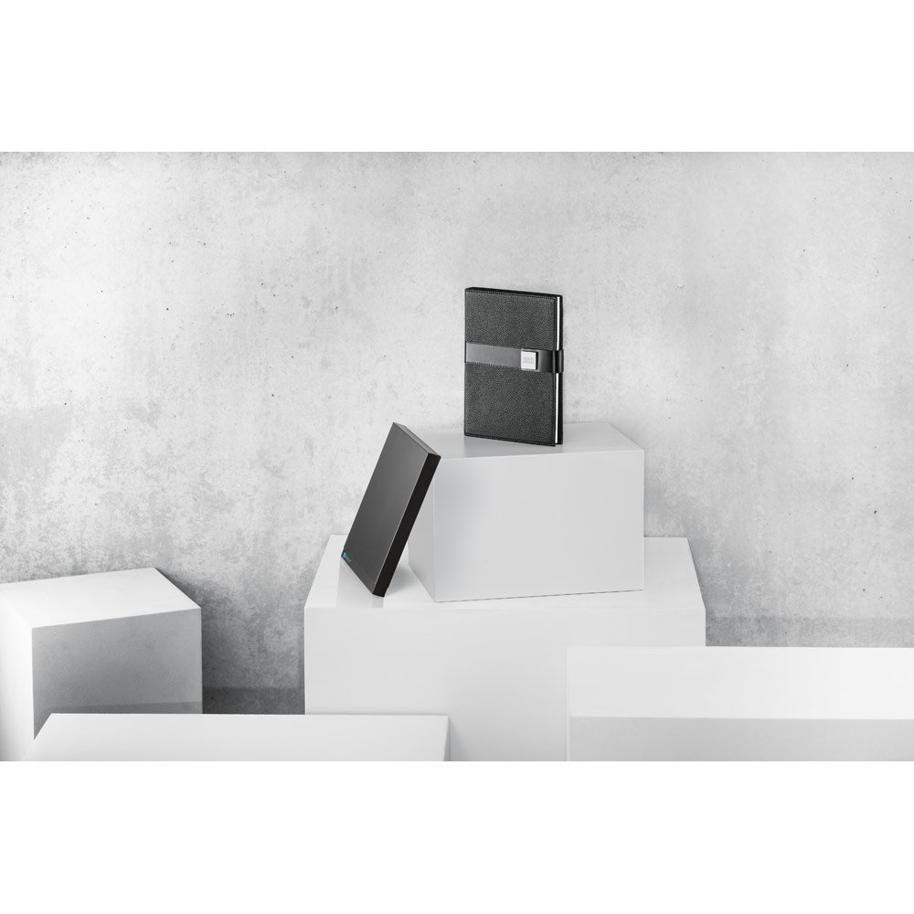 O EMPIRE é um caderno A5 de design moderno, minimalista e com toque business. A capa dura em couro protege o seu interior que, de forma inteligente, se divide em três partes distintas com um separador que permite identificar cada uma das partes. As suas 120 folhas em papel proveniente de gestão florestal sustentável, dividem-se proporcionalmente por folhas não pautadas, pautadas e pontilhadas. O seu design minimalista é complementado pelo detalhe metálico no fecho, característico desta linha de produtos e que reforça a sua elegância. Produto fornecido com suporte de esferográfica (não inclusa). Fornecido em caixa presente. 150 x 210 mm | Caixa: 197 x 28 x 262 mm