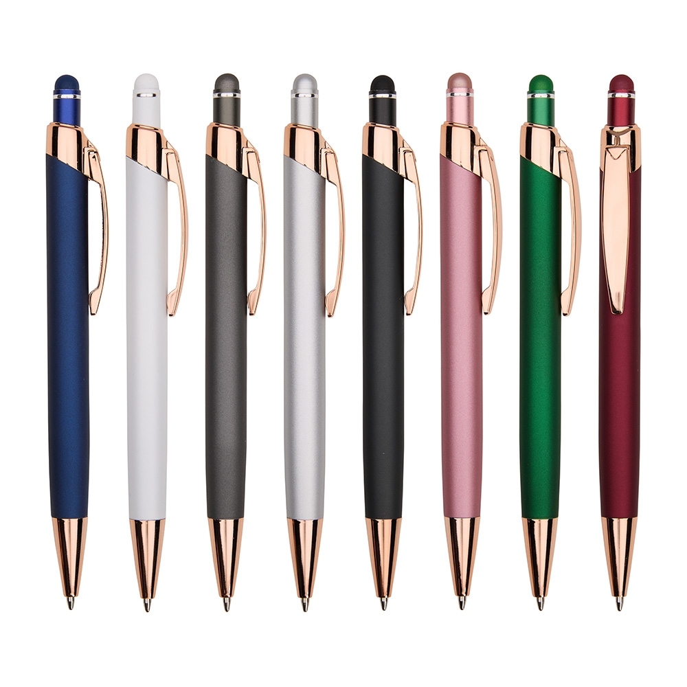 Descrição: Caneta metálica com carga esferográfica azul de 1,0mm e acionamento por clique de revestimento emborrachado para interação em dispositivos com telas sensíveis ao toque.