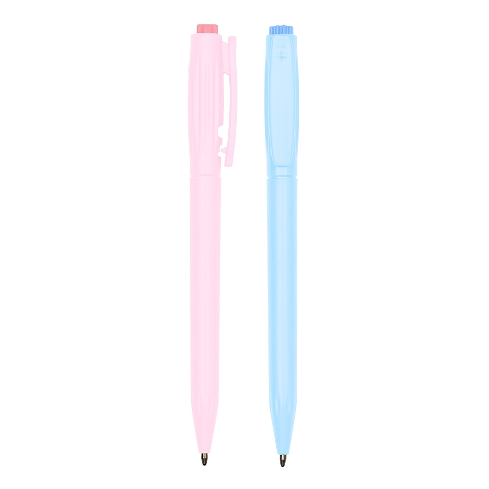 Descrição: Caneta plástica com detalhes em relevo, acionamento em clique e destravamento ao pressionar a parte inferior do clip e carga esferográfica azul de 1.0mm, garantindo uma escrita precisa e pegada confortável.