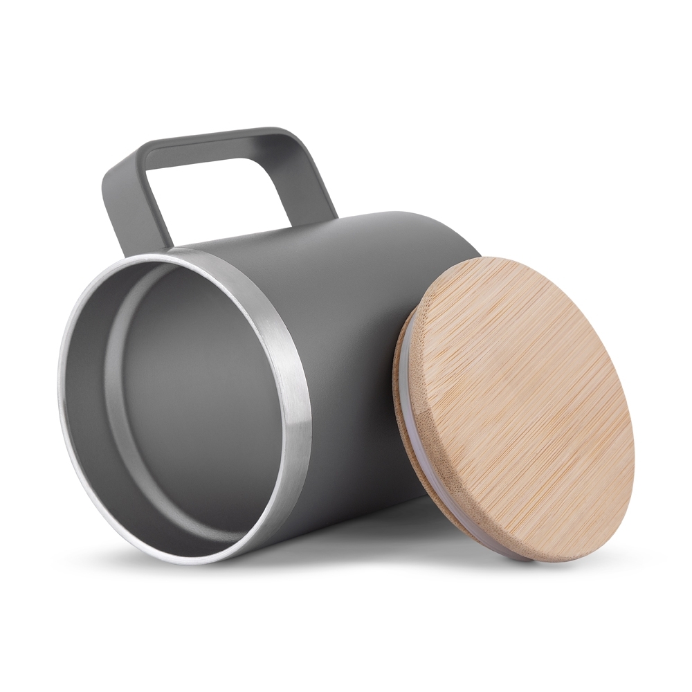 Descrição: Caneca térmica em inox com pintura eletrostática e capacidade de até 350ml. Apresenta estrutura de parede dupla, permitindo a conservação de líquidos por mais tempo. Dispõe ainda com tampa em bambu com anel de vedação em silicone.