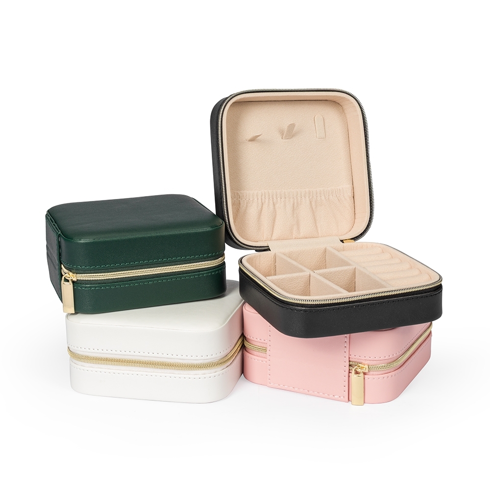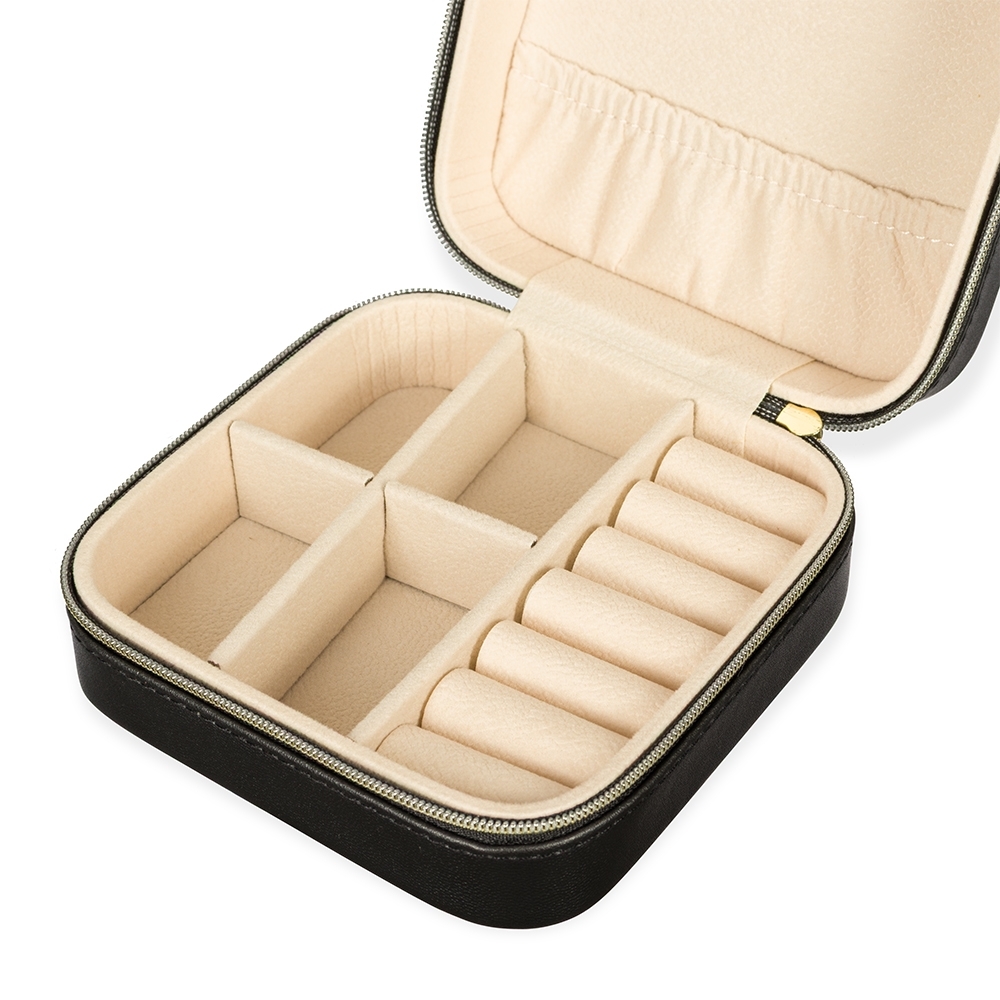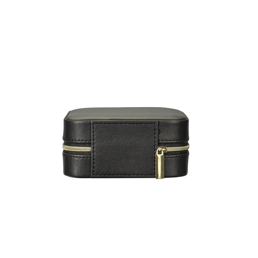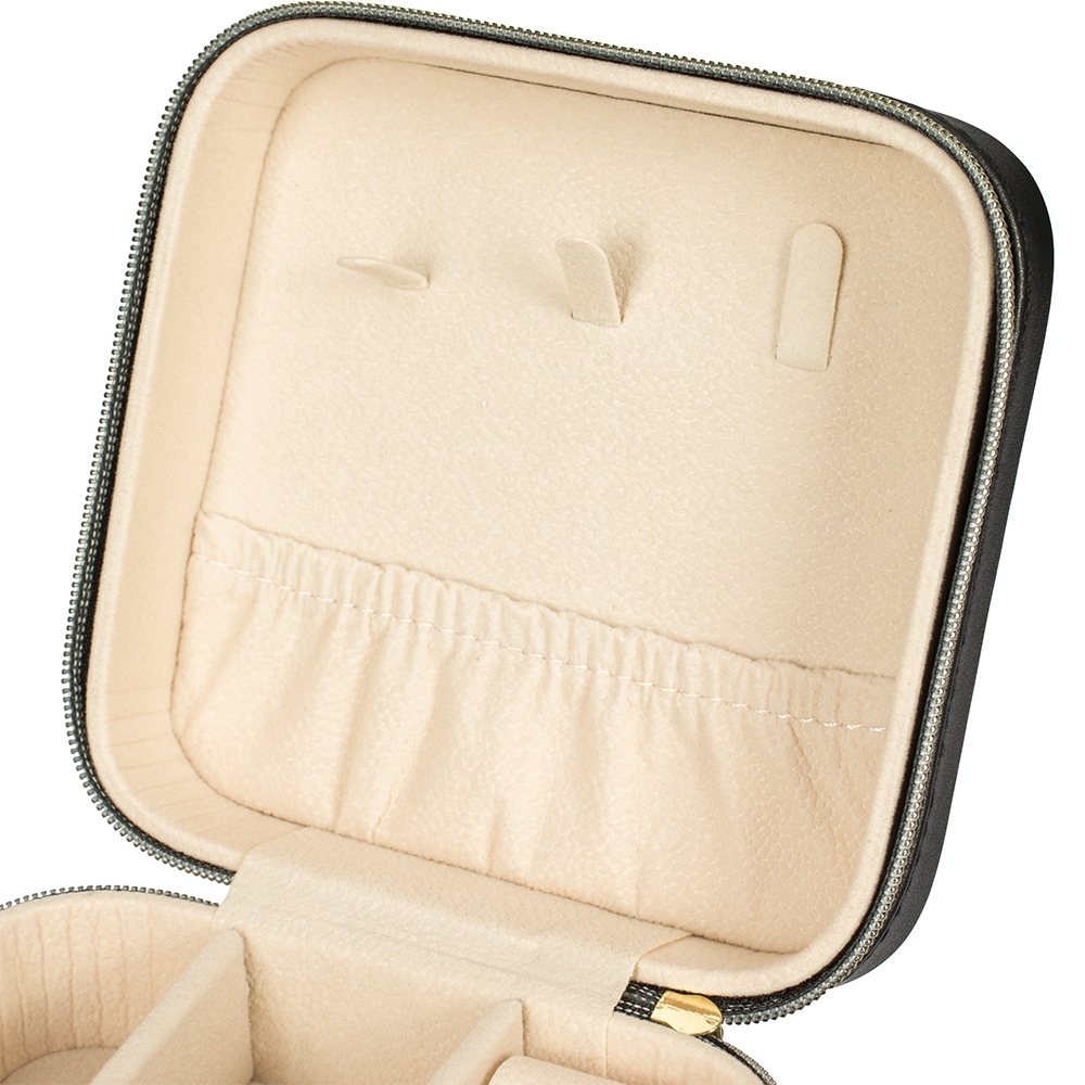 Descrição: Este porta-joias em couro sintético é uma opção compacta para armazenar objetos menores com segurança. Possui revestimento interno com textura macia e fechamento em zíper, além de três mini ganchos, um bolso com elástico, uma divisória removível com quatro quadrantes e um compartimento estofado com ranhuras.