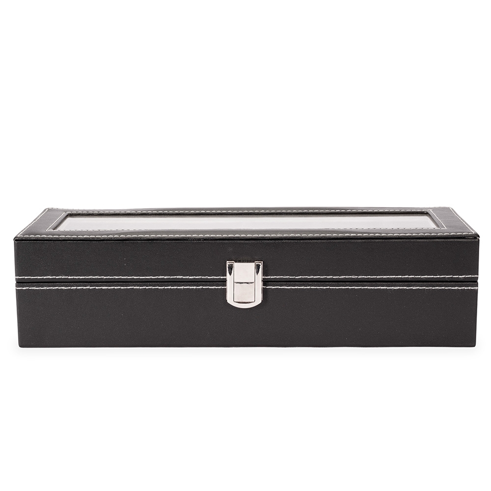 Descrição: Porta-relógios com acabamento em couro sintético à base de PVC. Possui revestimento interno em veludo e seis divisórias com almofadas removíveis, além de visor de vidro na tampa e trava de segurança para o fechamento do estojo.