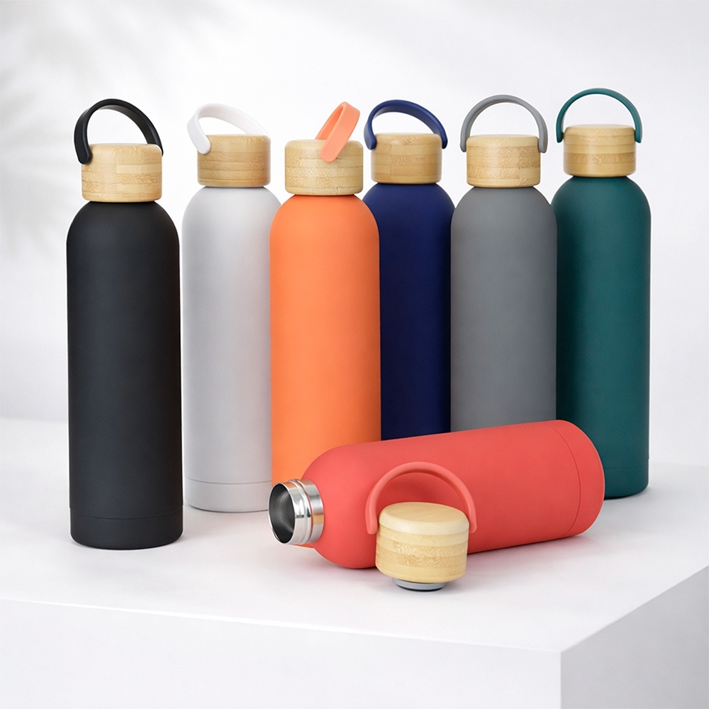 Descrição: Garrafa térmica em inox com pintura emborrachada e capacidade para até 500ml. Possui estrutura de parede dupla e vedação a vácuo que permite conservar a temperatura de bebidas por mais tempo, além de tampa rosqueável em bambu com alça plástica para transporte.