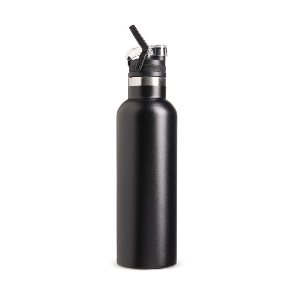 Descrição: Garrafa térmica em inox 304 com capacidade de até 800ml. Possui estrutura de parede dupla e vedação a vácuo, permitindo conservar a temperatura de bebidas por mais tempo. Apresenta uma tampa rosqueável em plástico com protetor para o bocal e trava de segurança integrada à alça.