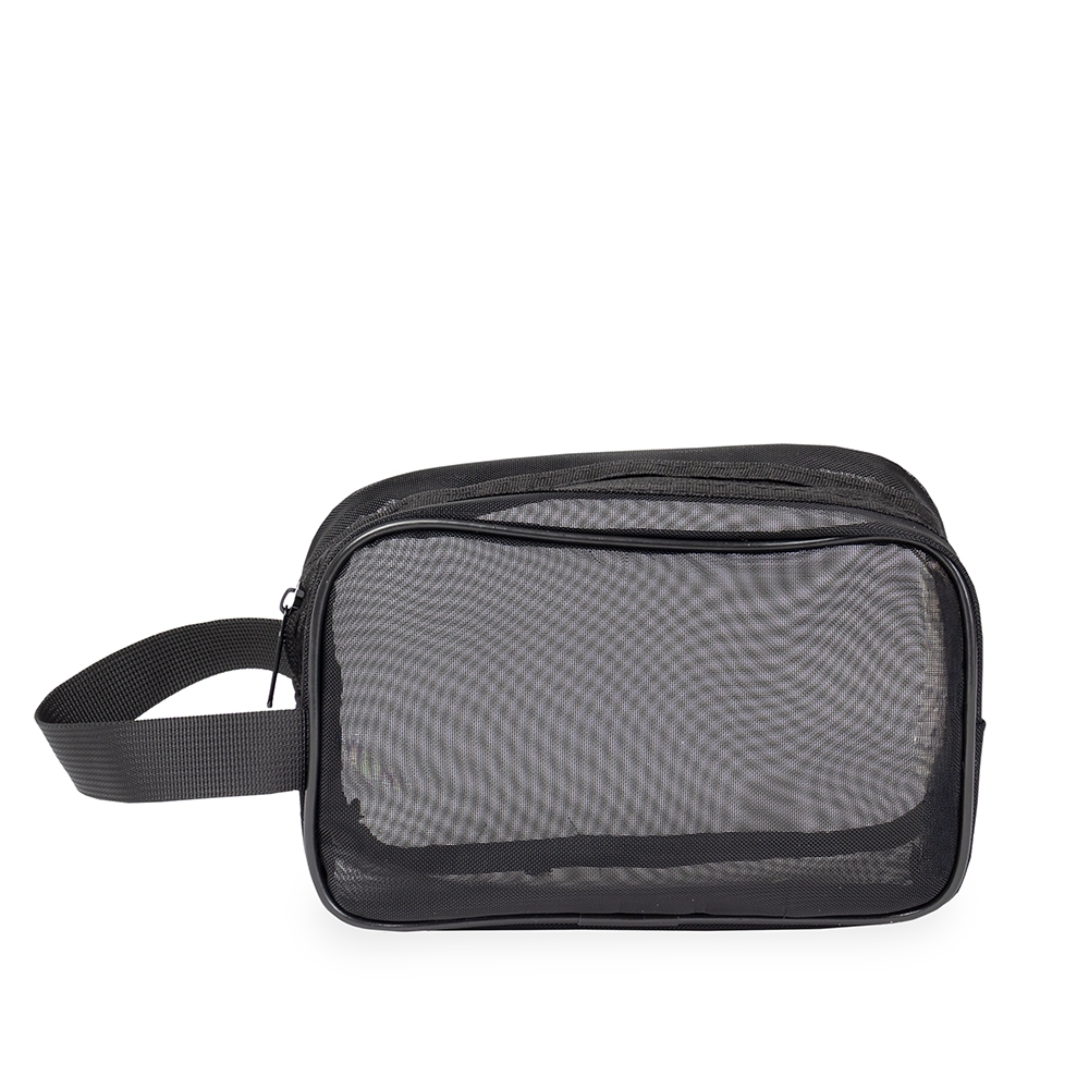 Descrição: Nécessaire confeccionada em tela de nylon com fechamento em zíper e alça lateral para transporte.